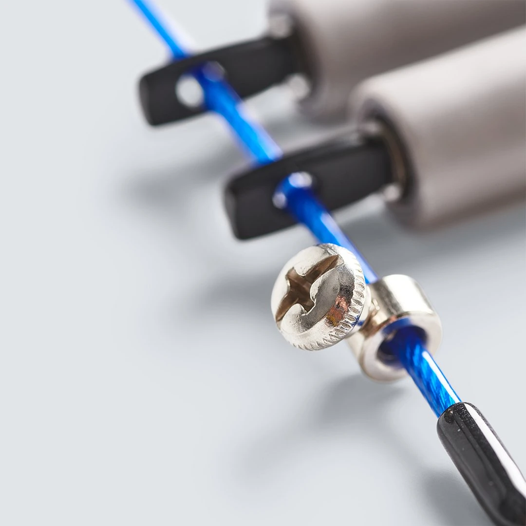 Comba diseñada para desarrollar velocidad, rapidez, agilidad y coordinación. Comba de acero recubierta de PVC para dar la máxima protección. Fabricada en ABS, con sistema giratorio para facilitar el paso de la cuerda. Tornillo de agarre en el mango para dar seguridad en el salto. Especifica para boxes por su capacidad de ajuste.